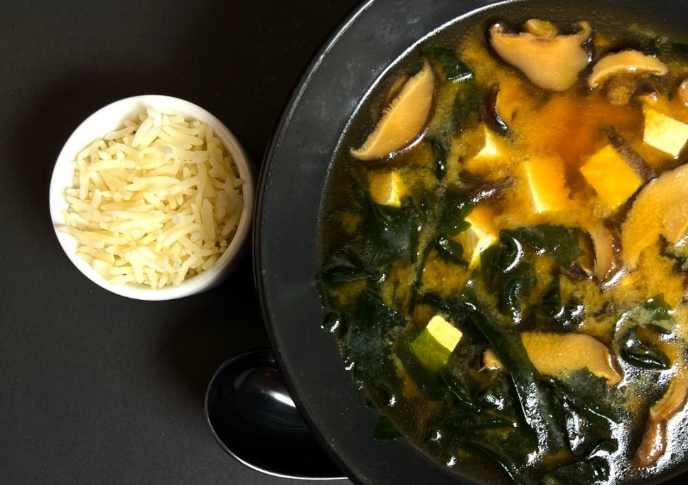 350g🇯🇵Класичний японський суп на основі пасти місо, яка є продуктом бродіння та ферментації сої та рису, з додаванням тофу і водоростями вакаме, з насиченим морським ароматомМісо бульйон, водорості вакаме, тофу, гриби шиїтаке, рис